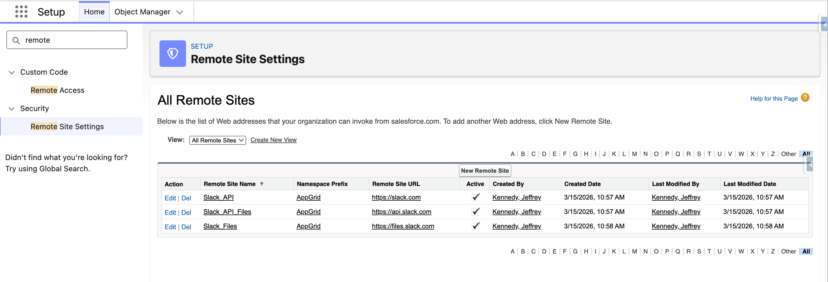If you have created a Slack application and want to link that to AppGrid, you will need to configure the following remote site settings as shown in the image below. These settings allow Apex to connect with the Slack Api.