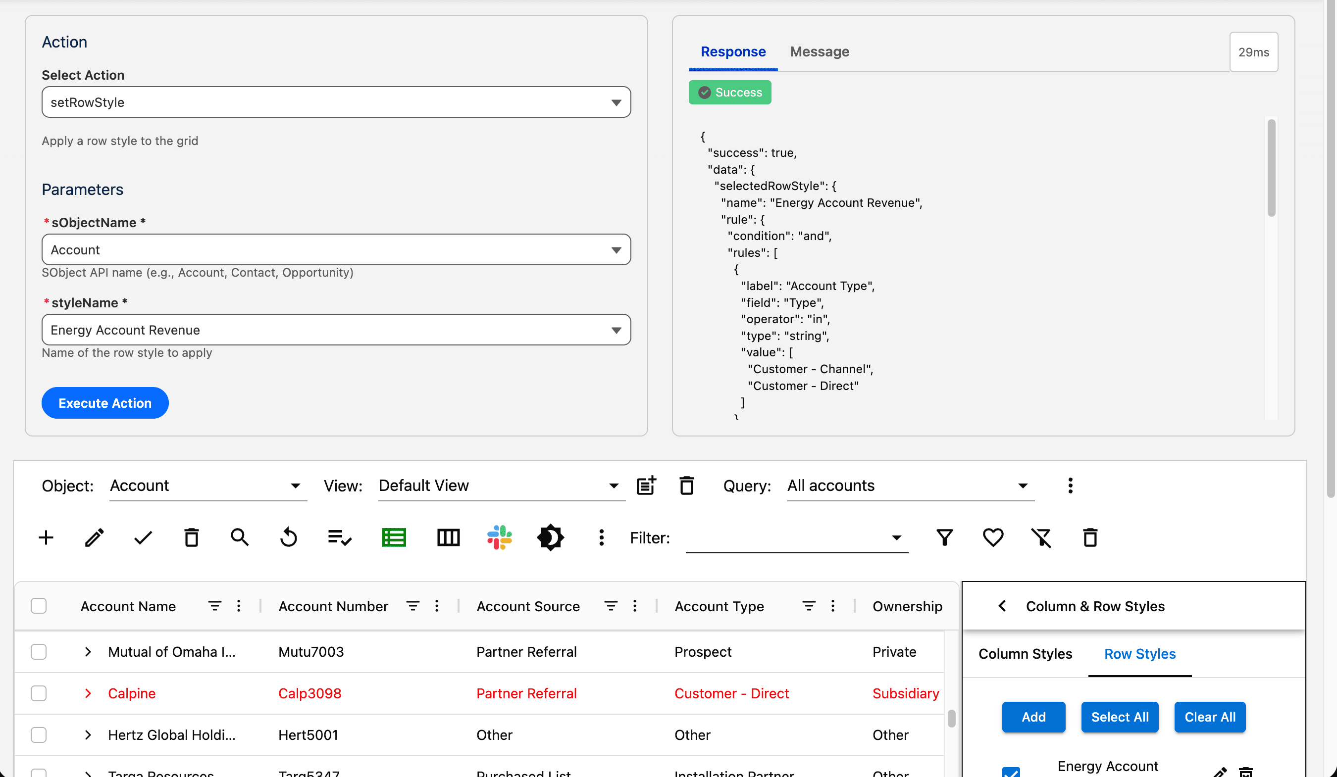 This api method applies a row style to the grid. Select a SObject. The styles dropdown will display all row styles that are defined for the selected object. Pick a style and click Execute Action. The selected row style will be applied to AppGrid. If the AppGrid selected object does not match the object name provided by the api, the api handler will switch the AppGrid selected object before applying the row style.