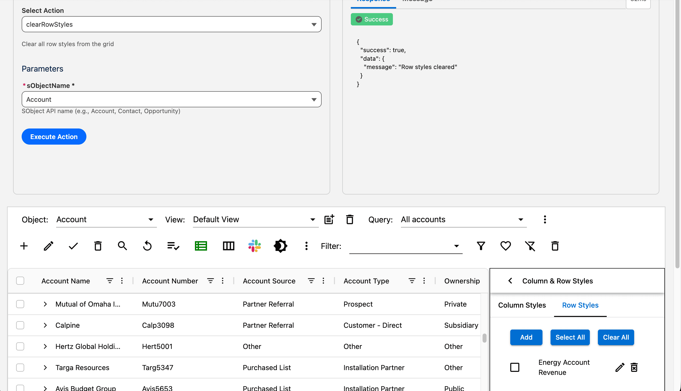 This api method clears all active row styles Select a SObject and click Execute Action. If the AppGrid selected object does not match the object name provided by the api, the api handler will switch the AppGrid selected object before clearing the row styles.