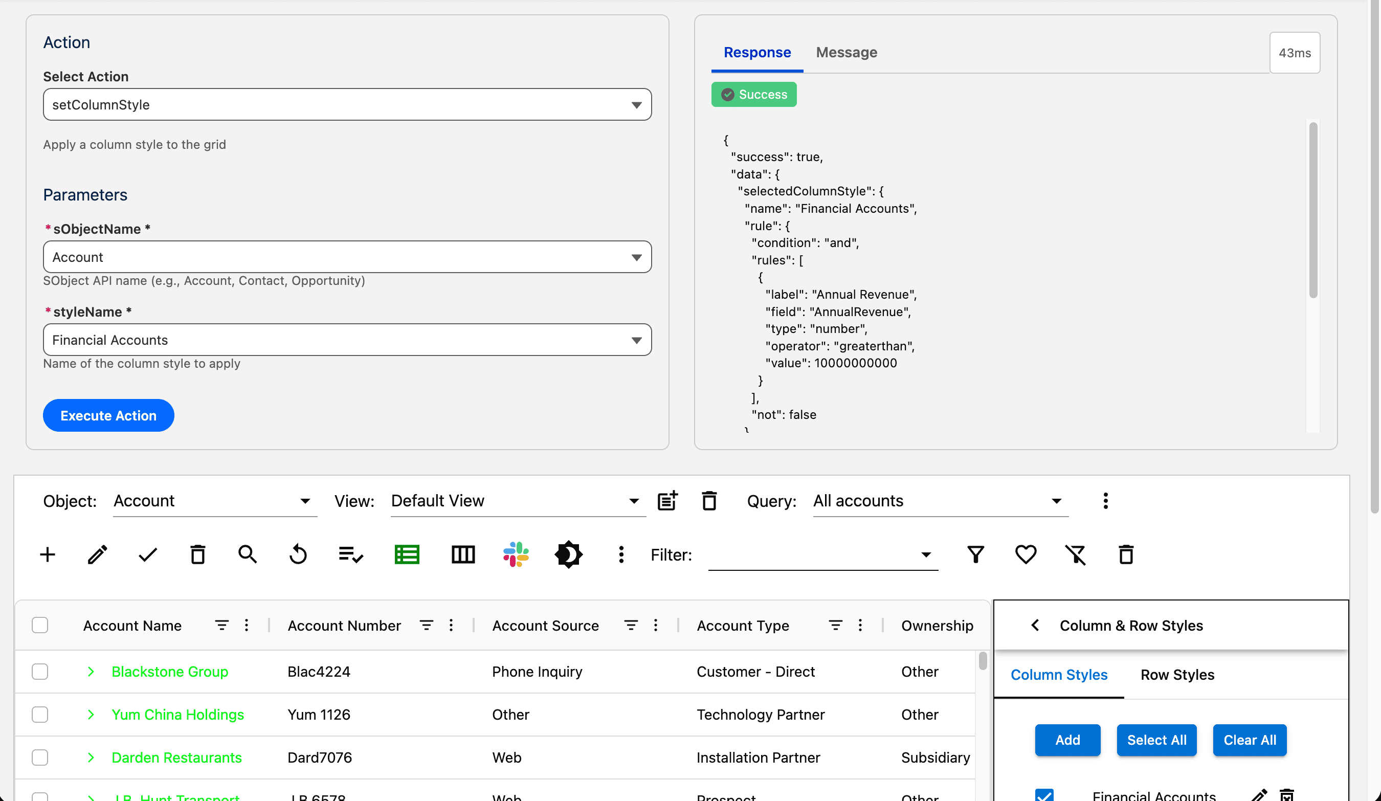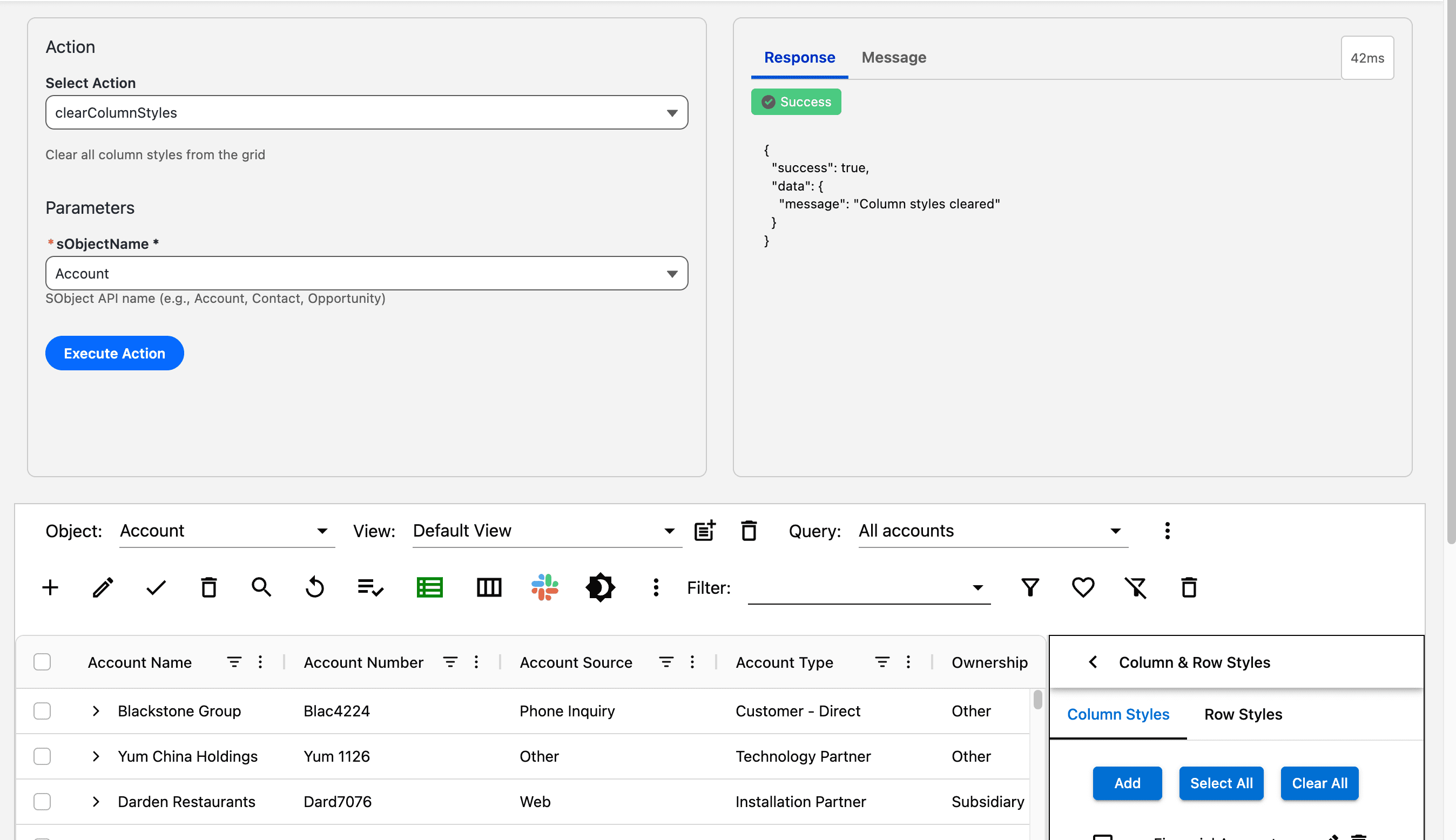 This api method clears all active column styles Select a SObject and click Execute Action. If the AppGrid selected object does not match the object name provided by the api, the api handler will switch the AppGrid selected object before clearing the column styles.