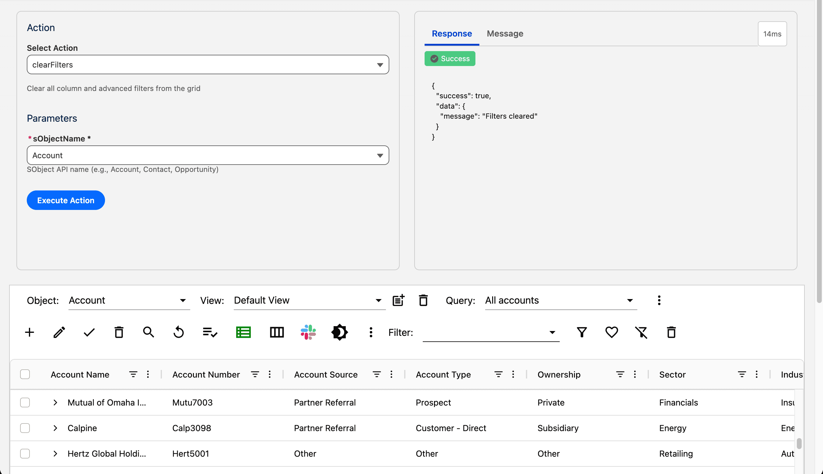 This api method clears all column and advanced filters applied to the grid. Select a SObject and click Execute Action. If the AppGrid selected object does not match the object name provided by the api, the api handler will switch the AppGrid selected object before clearing the grid filters.