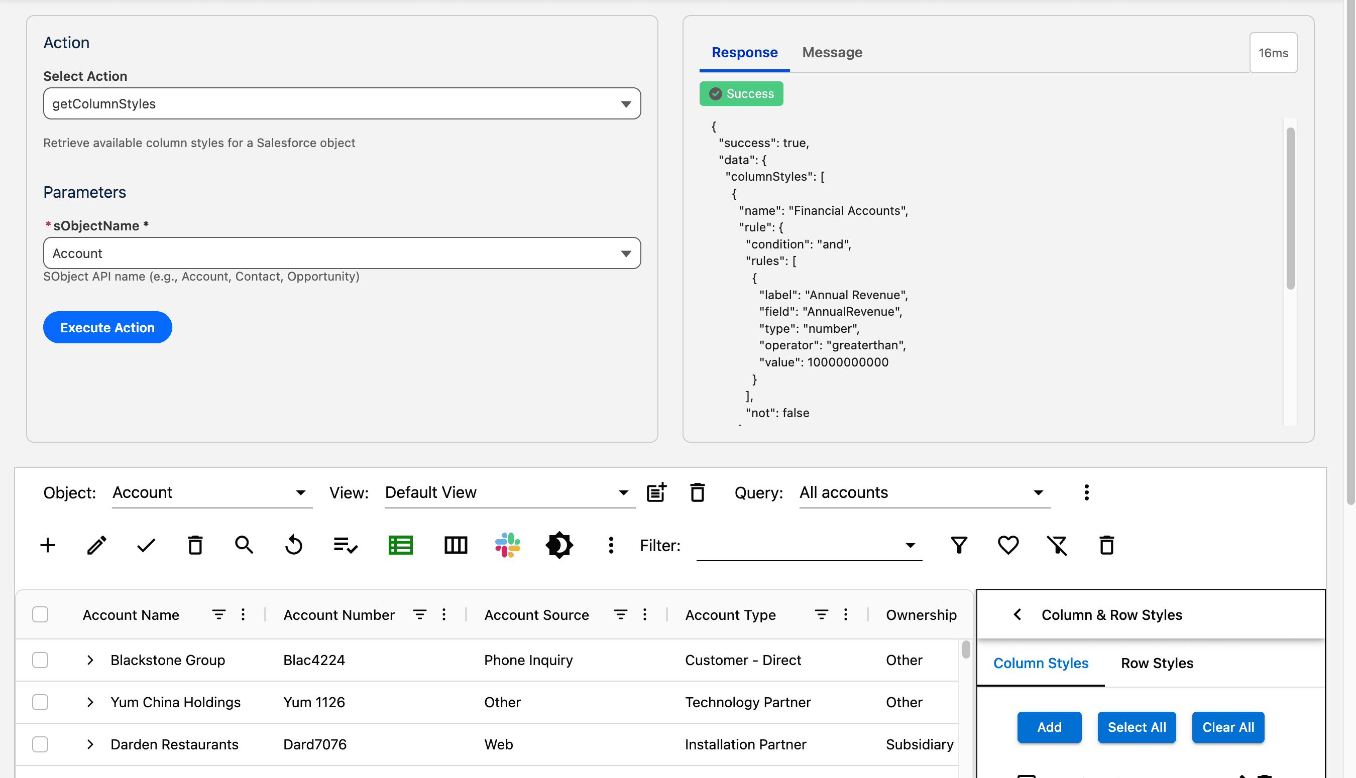 This api method returns the column styles for a given SObject. The filters dropdown will display all advanced filters that are defined for the selected object. Select an sObject and click Execute Action. The column styles will be returned in the JSON array.