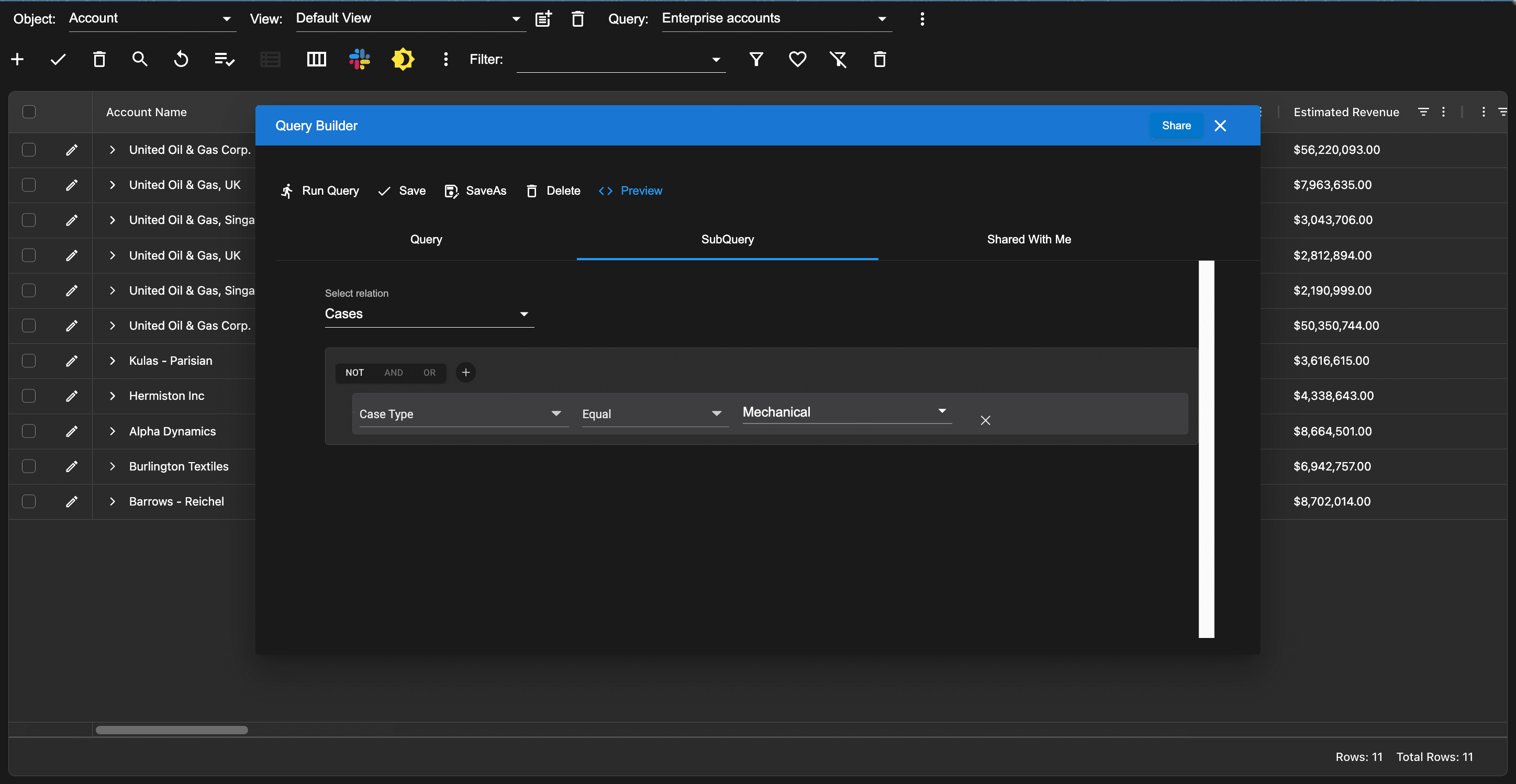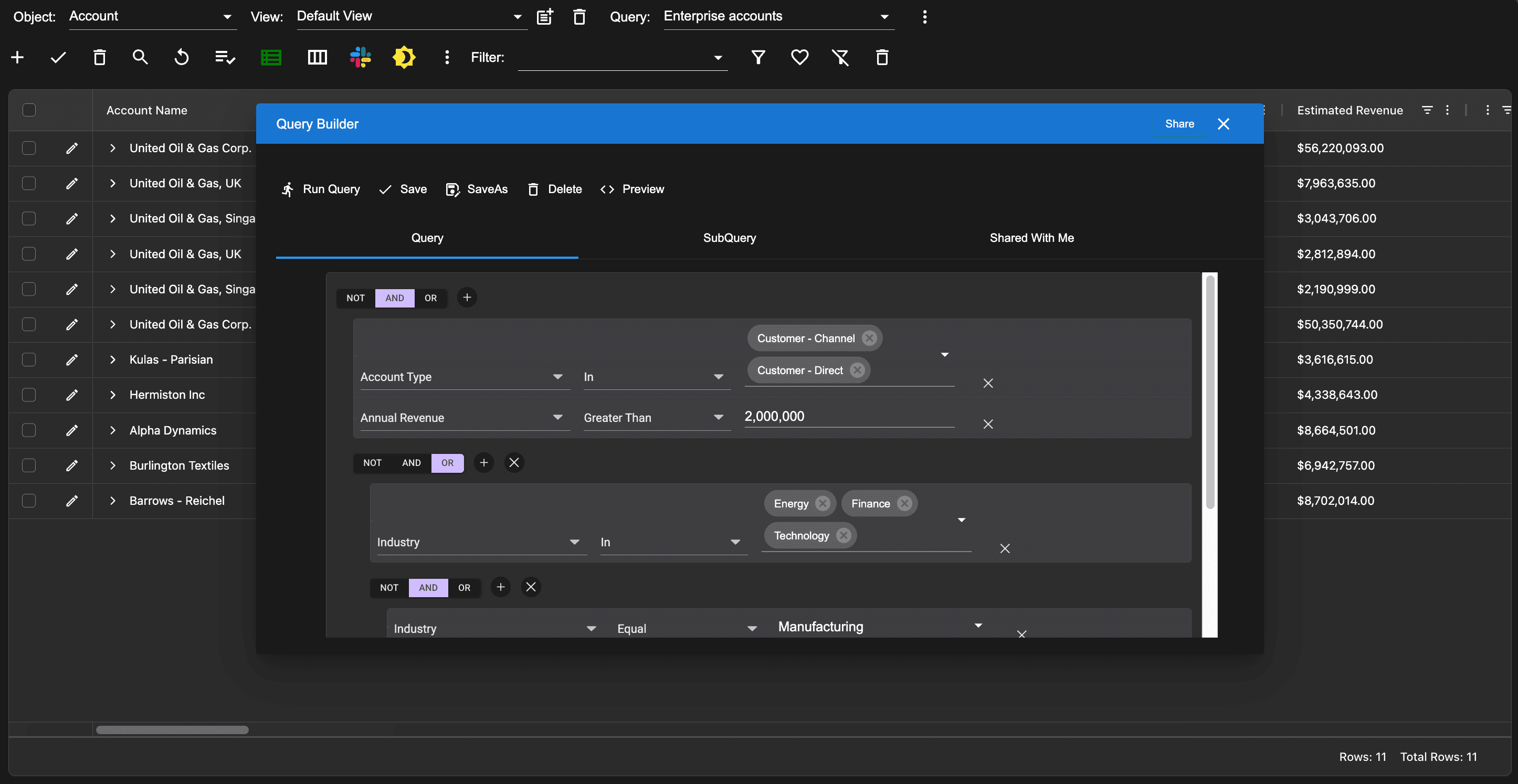 In the image above, we created a complex 4 level hierarchical query to demonstrate the ability of the AppGrid query functionality. This query finds accounts where all of the following are true: