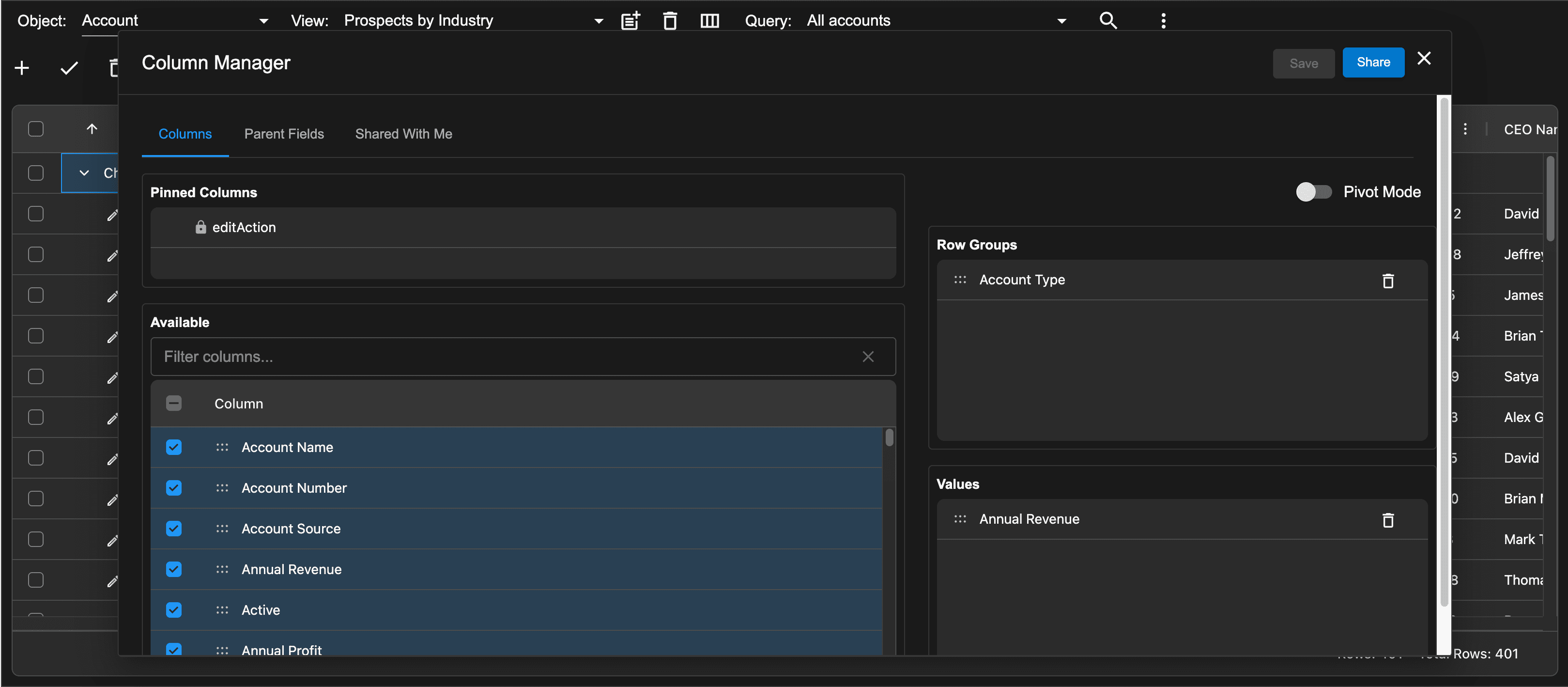 AppGrid provides the ability to create multiple views for a given object. If we are viewing Account records, we may want to configure a list view, a grouped view and/or a pivot view. Depending on our workflow, this allows us to present information in the most optimal way to accomplish our task.