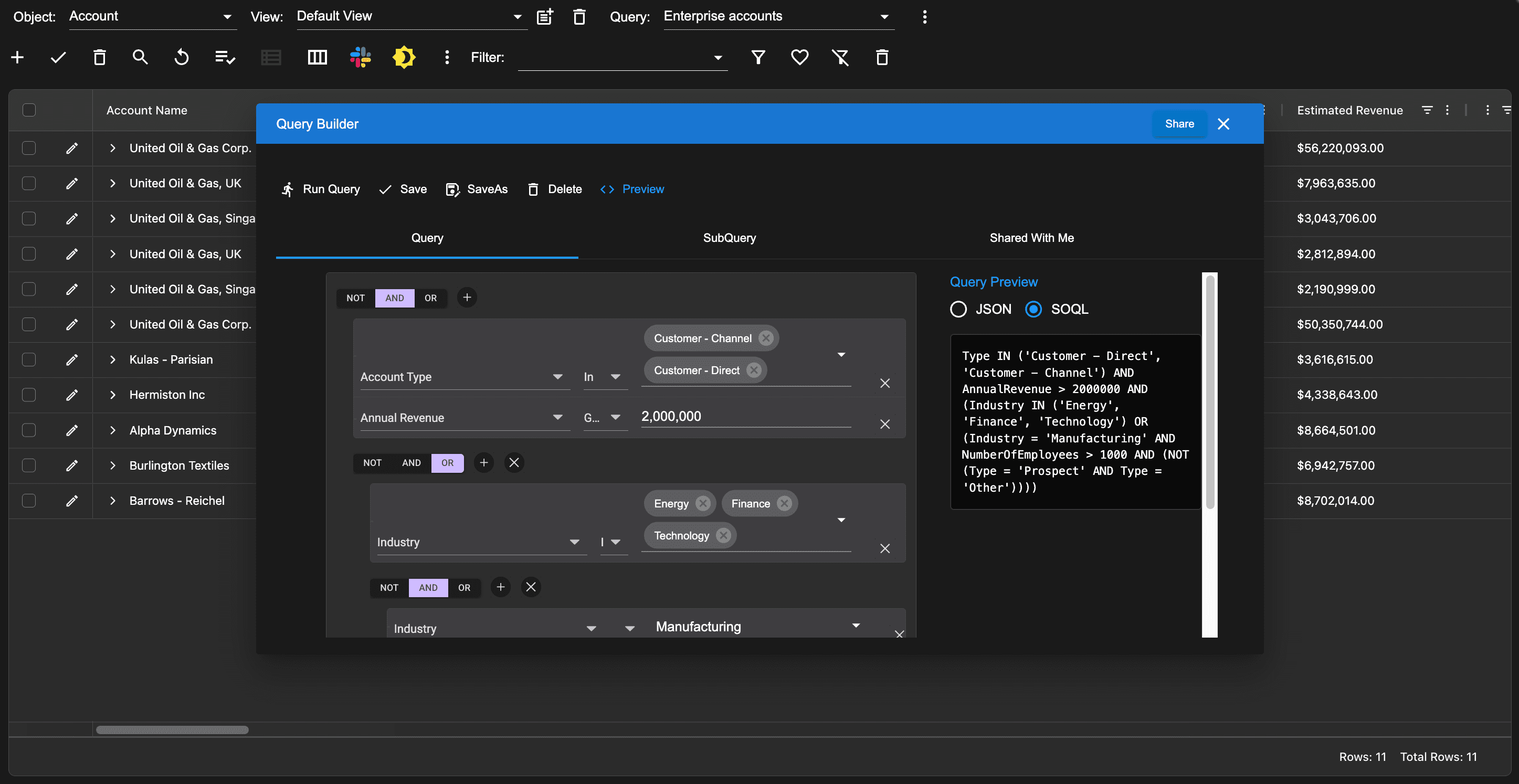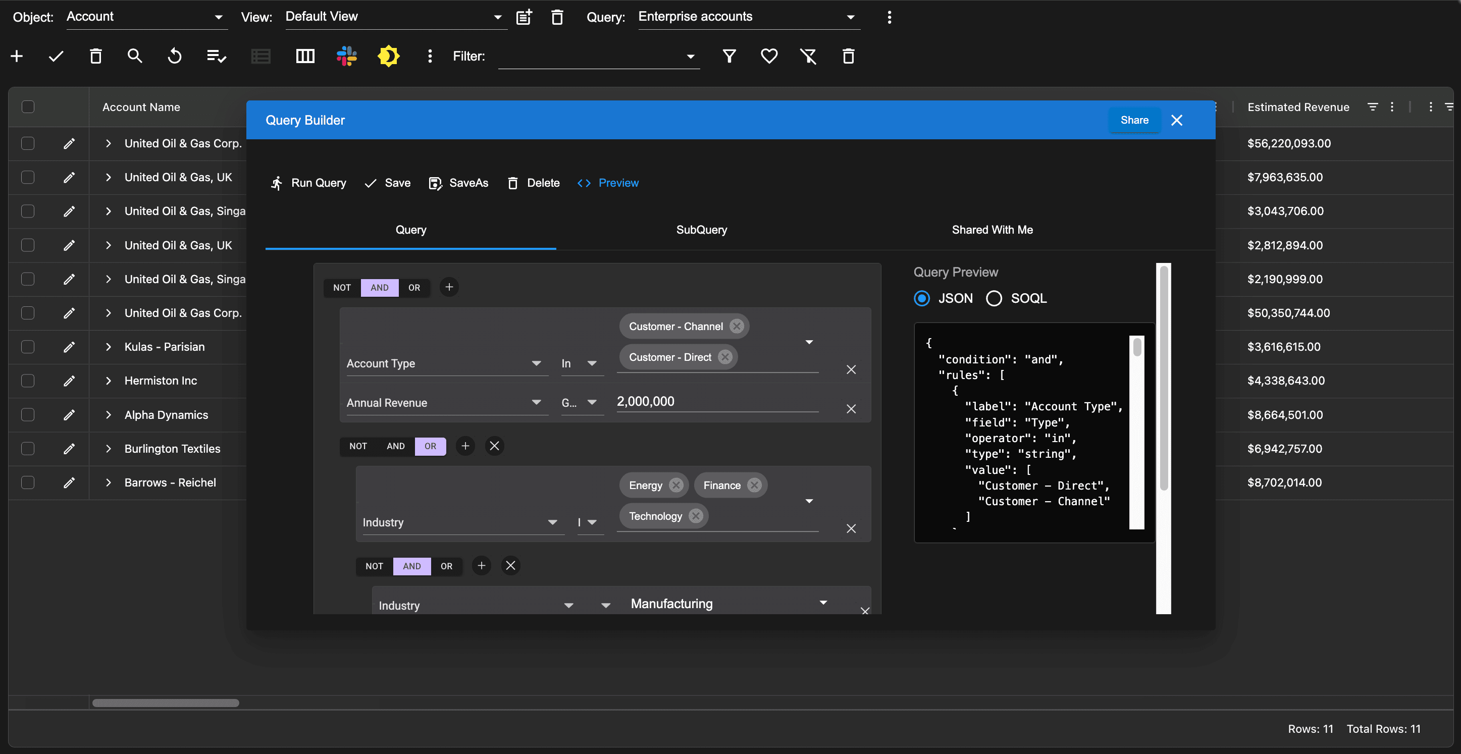 The QueryBuilder provides the ability to preview the query rule in either JSON or SOQL format. This helps users understand how their query rule will be executed. Click the preview button to see this information.
