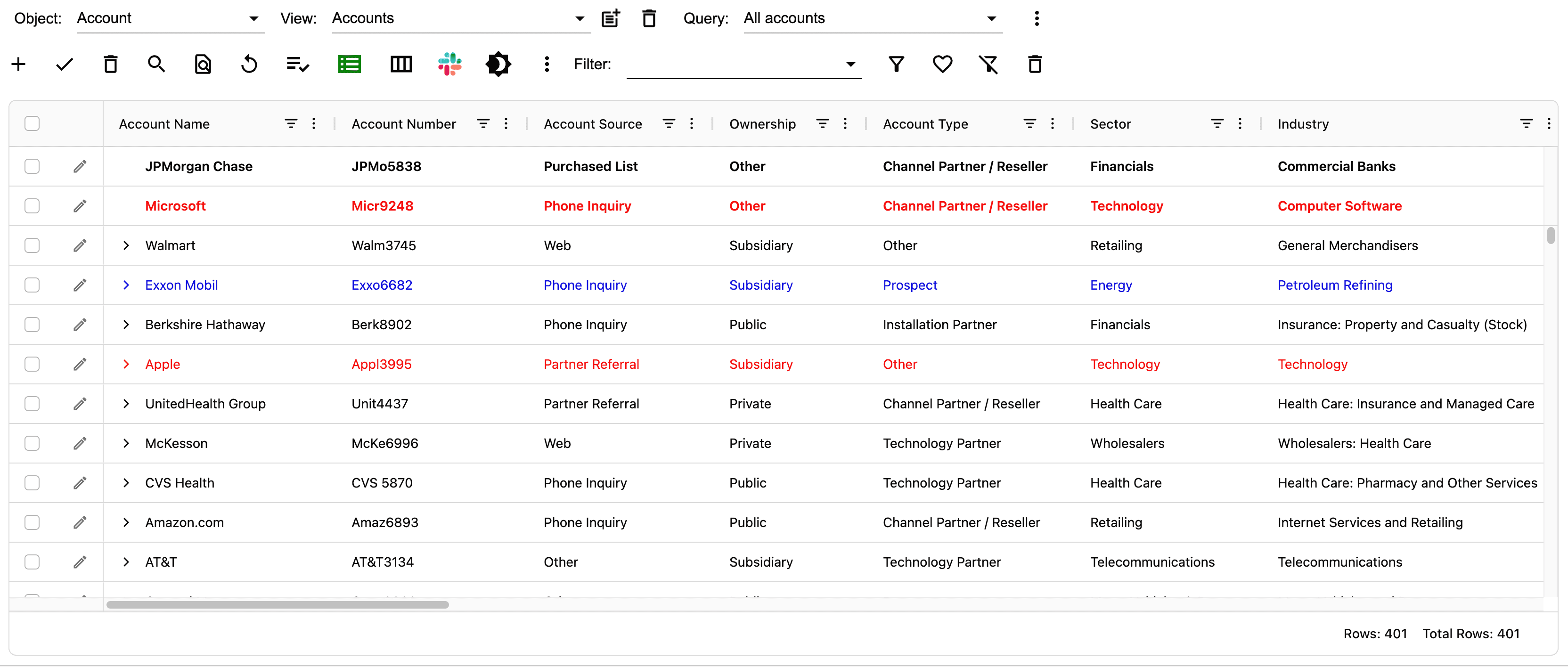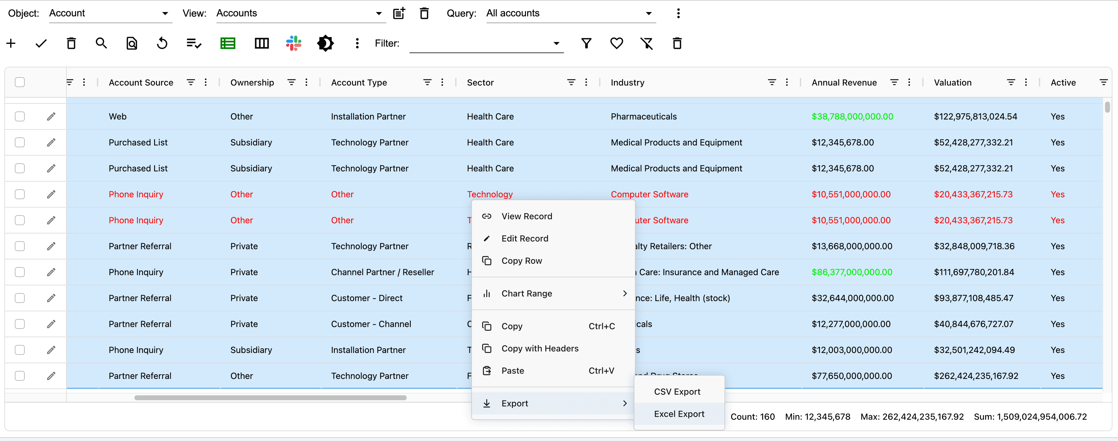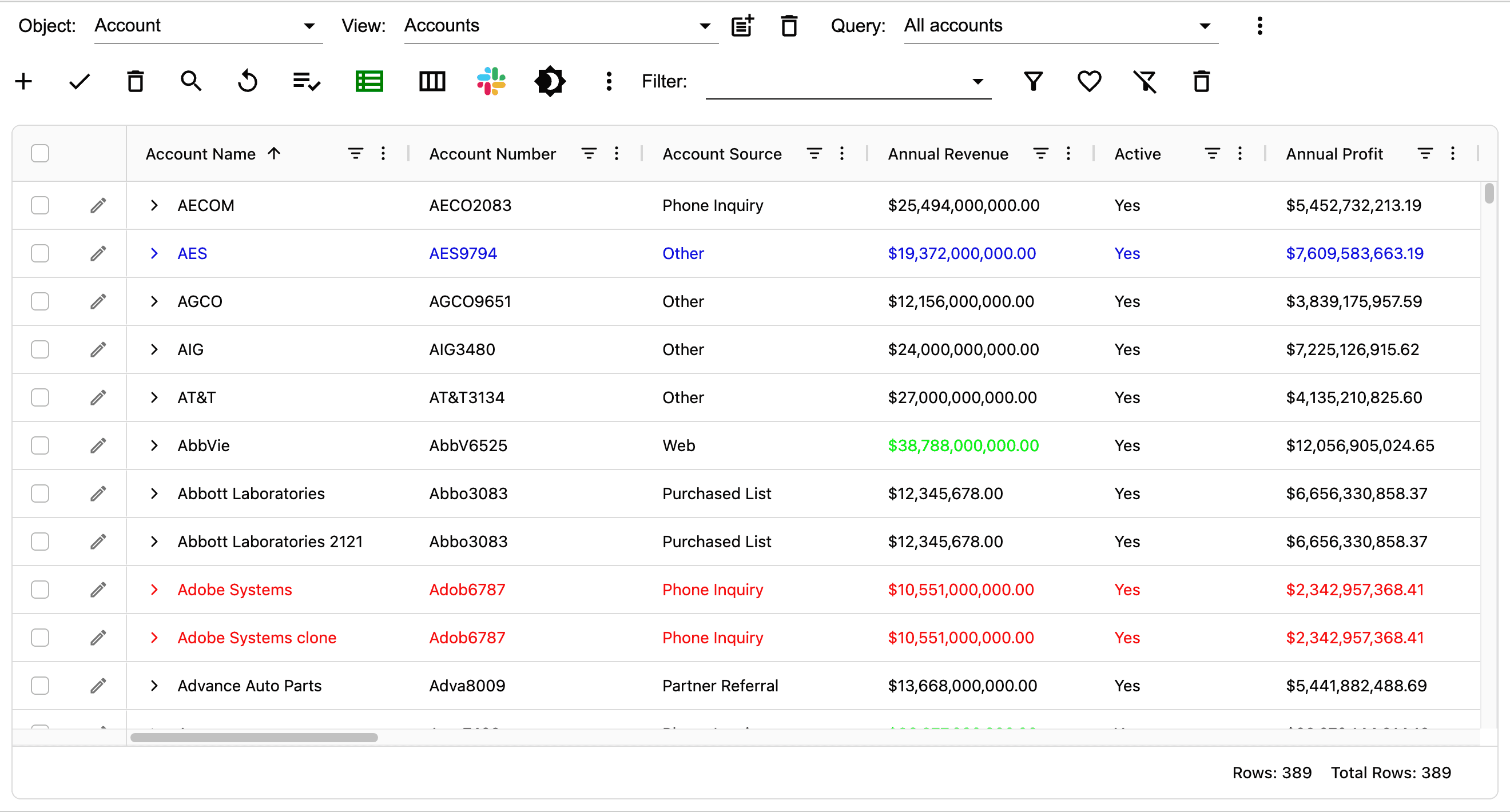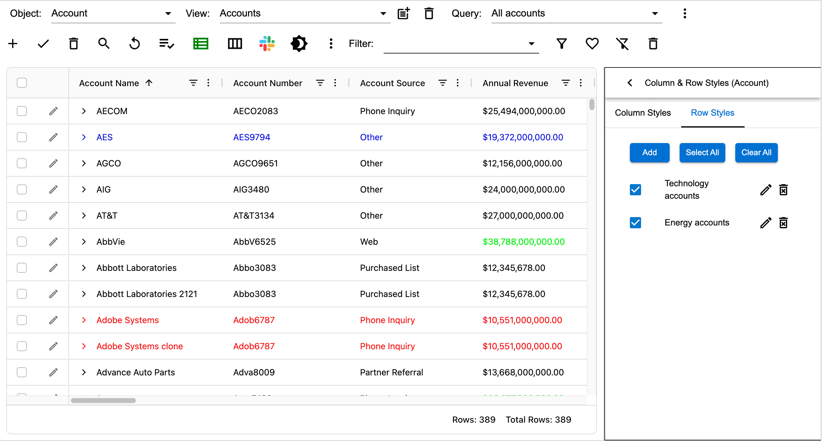 AppGrid provides the ability to create styles for rows and columns. This ability turns data into information by highlighting values that we want to alert the user to. In the image below, we have created a row style to highlight records where the Industry = Healthcare Insurance AND where the AccountType = Customer Channel AND where the AnnualRevenue > 5B.
