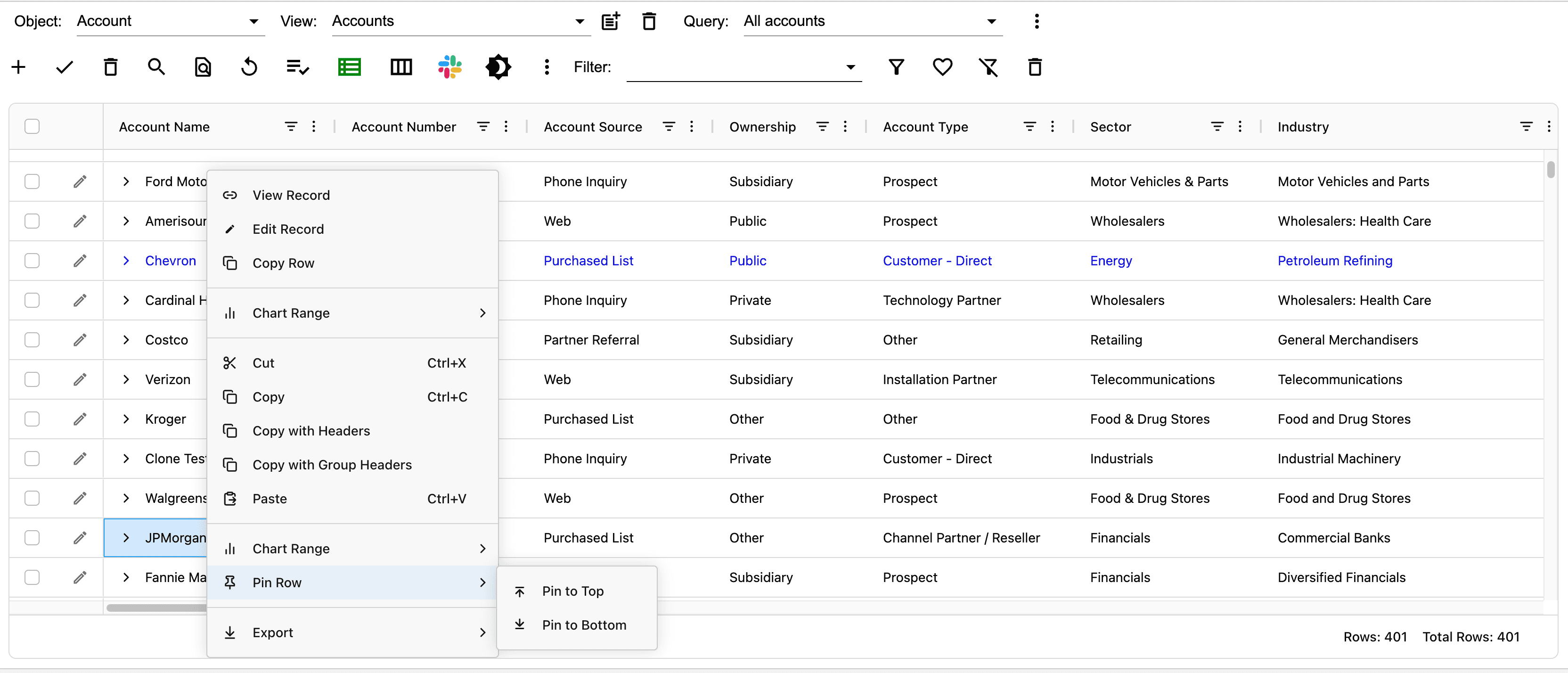 Pinned rows are styled in bold. In the example below, the top 2 rows are pinned. To unpin a row, right click on the record and select Unpin.