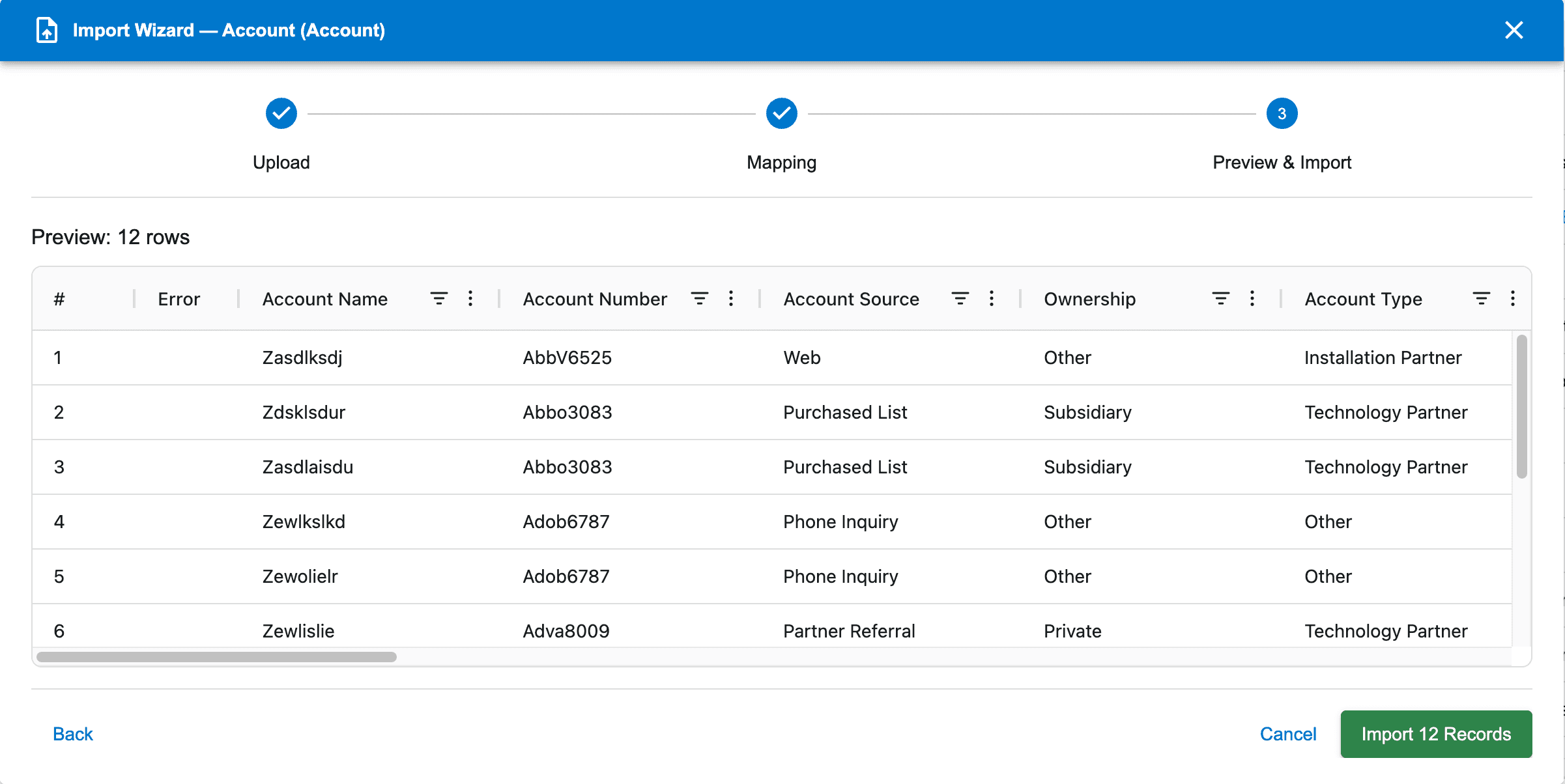 Review the data to be upserted and make any changes as required. Click the Import button when ready. A success notification will be displayed if the upsert was successful. If any records fail to upsert, an error icon will be displayed on each row and the records successfully updated will be removed from the grid. Hover over the icon to see the error message. Click the Retry button once you have fixed the data.
