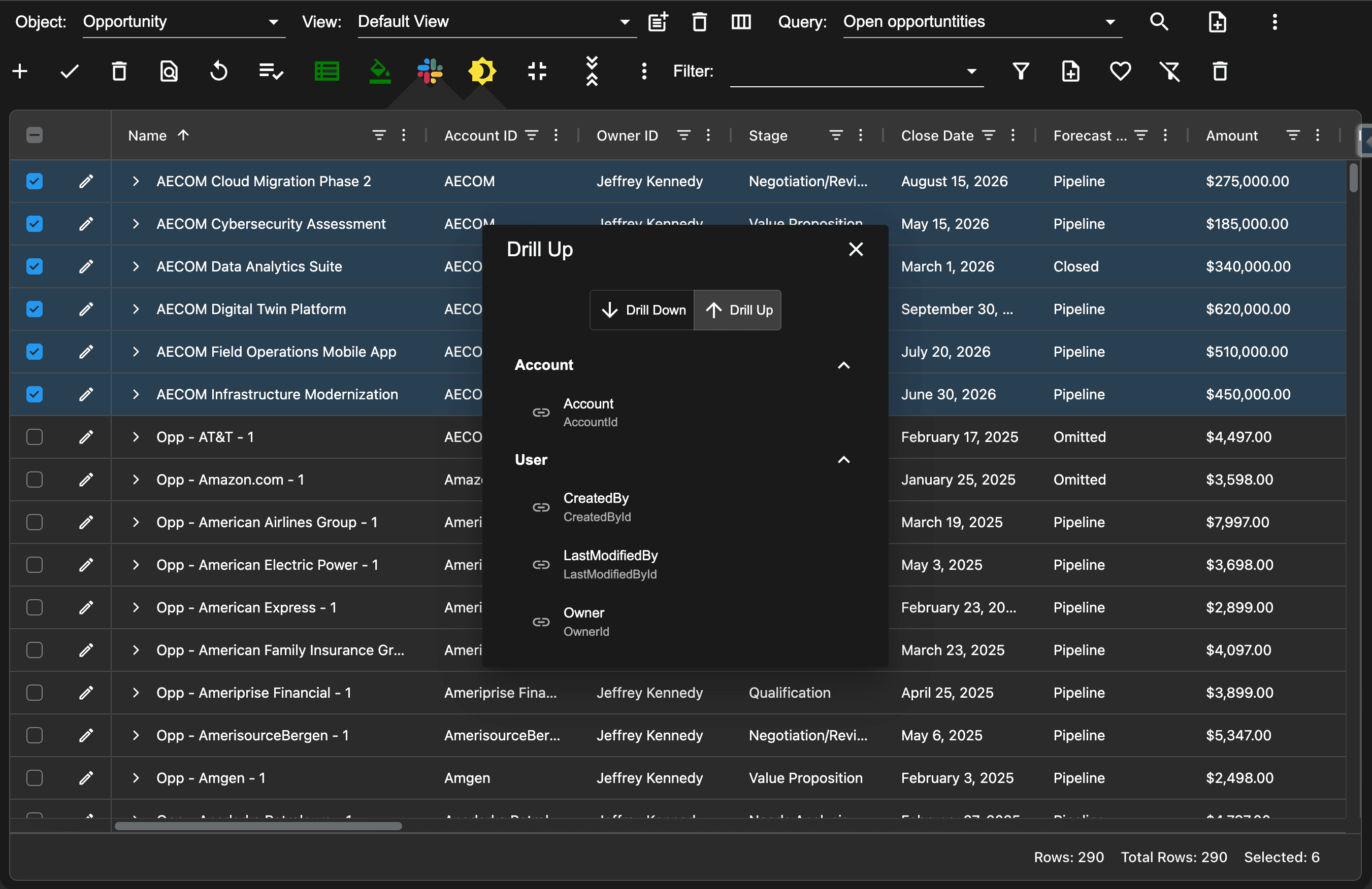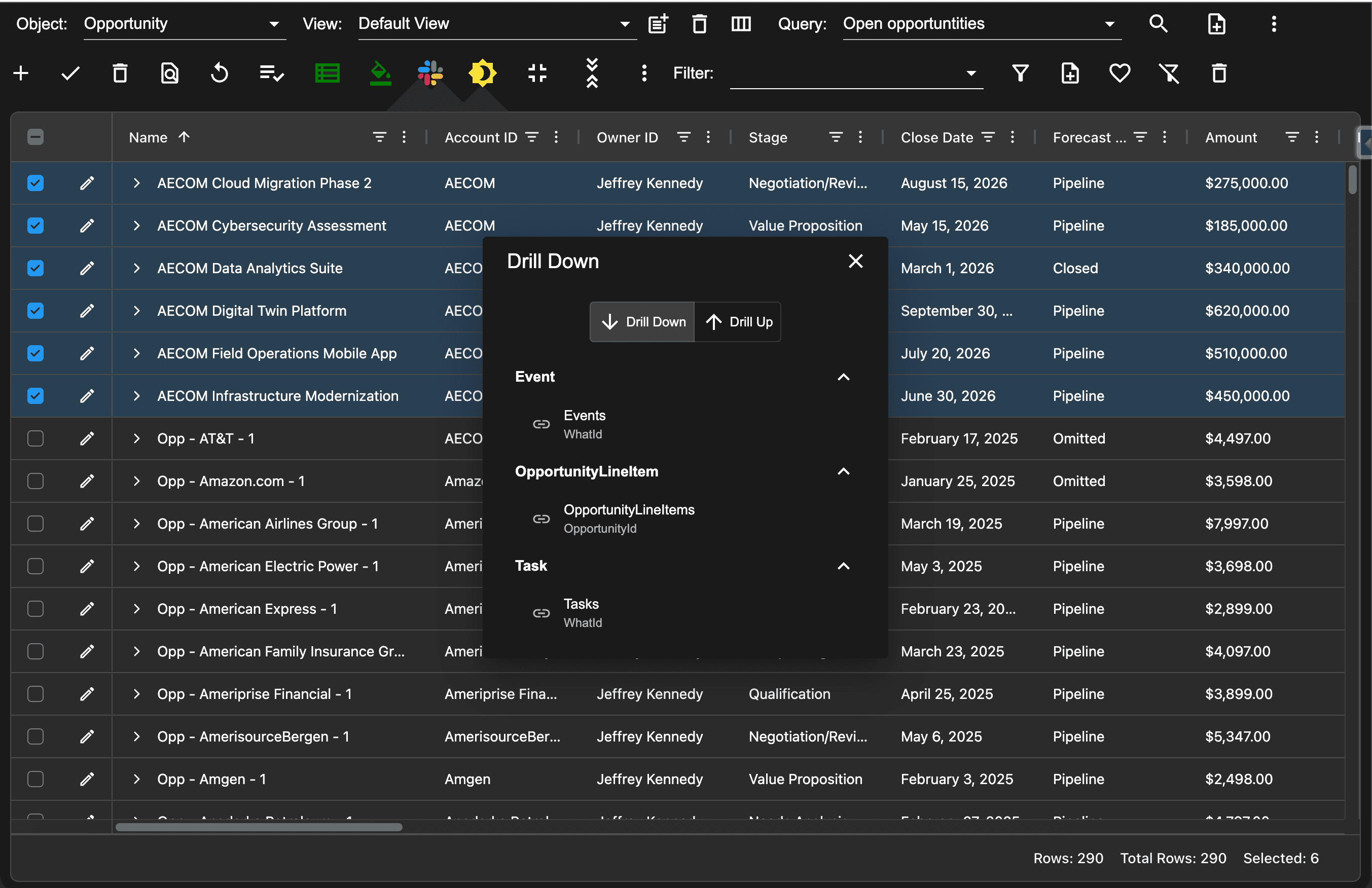 AppGrid's Drill Up and Drill Down feature eliminates that bottleneck. Start with any filtered set of records, then navigate to their related parent or child records in a single step — giving you a flat, actionable grid of every related record across your entire result set. Combined with AppGrid's built-in Salesforce Flow integration, you can filter, navigate, and act without ever leaving the grid.