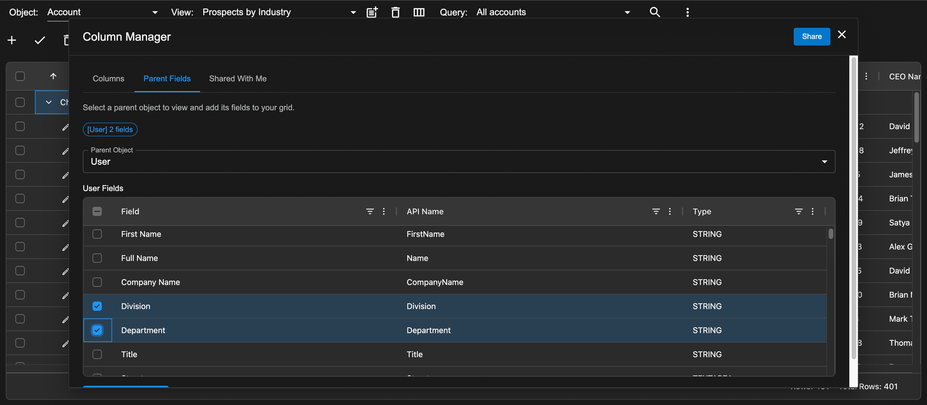 When defining a view, we can optionally add fields from a direct parent relation. In the image below, we have selected the User object. We added the Division and Department fields. This will be a read-only column.