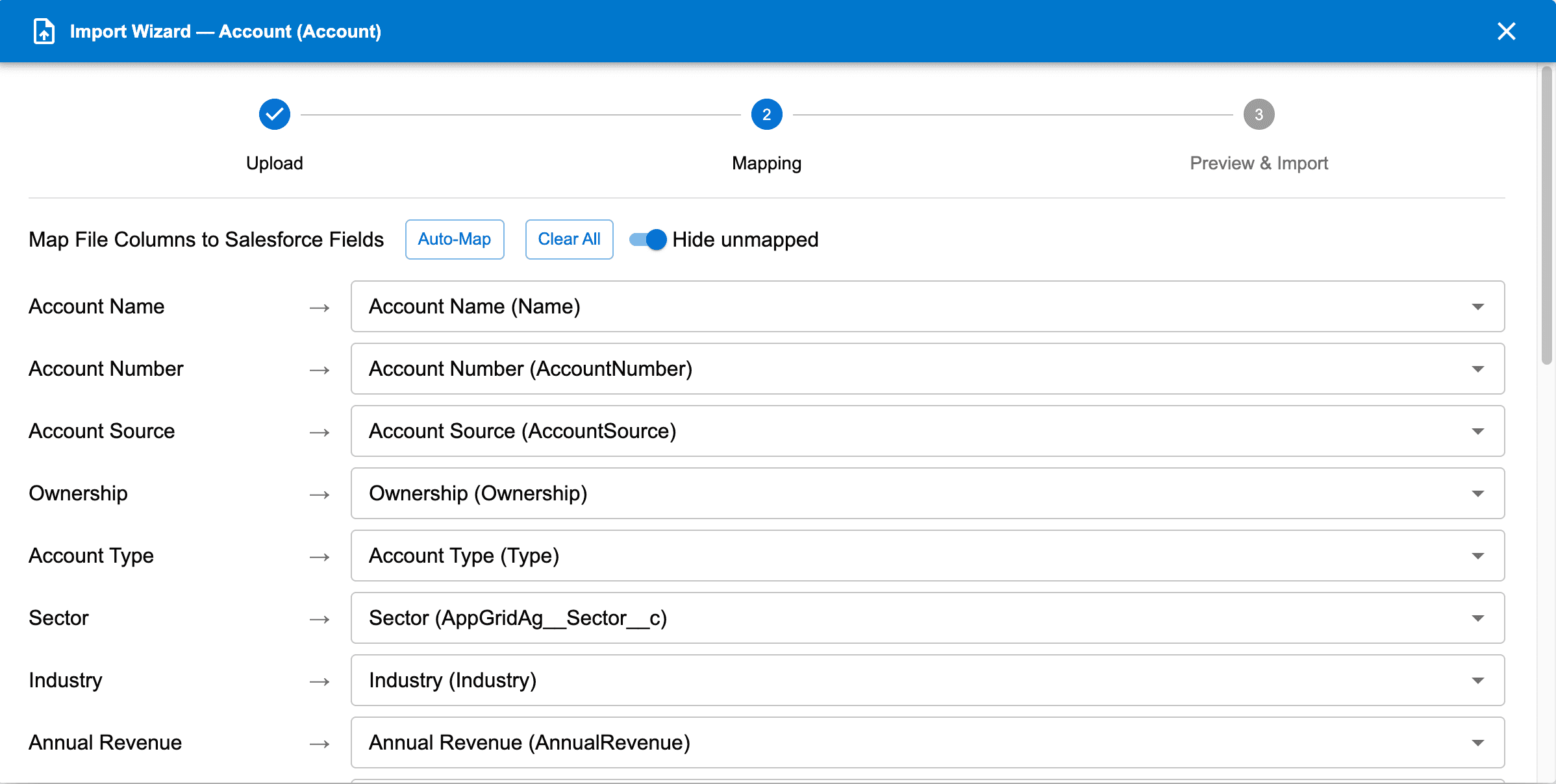 AppGrid will automatically map the fields to the extent possible. For any un-mapped fields, choose the correct Apex field. Click the next button to display the preview page.
